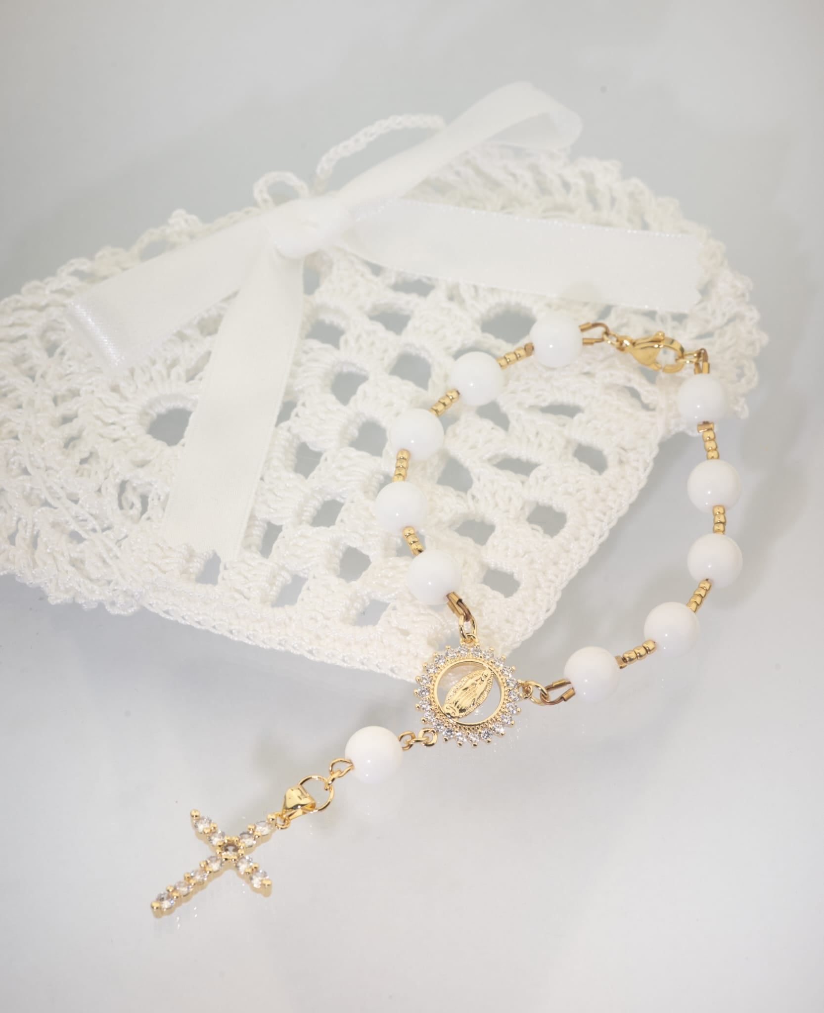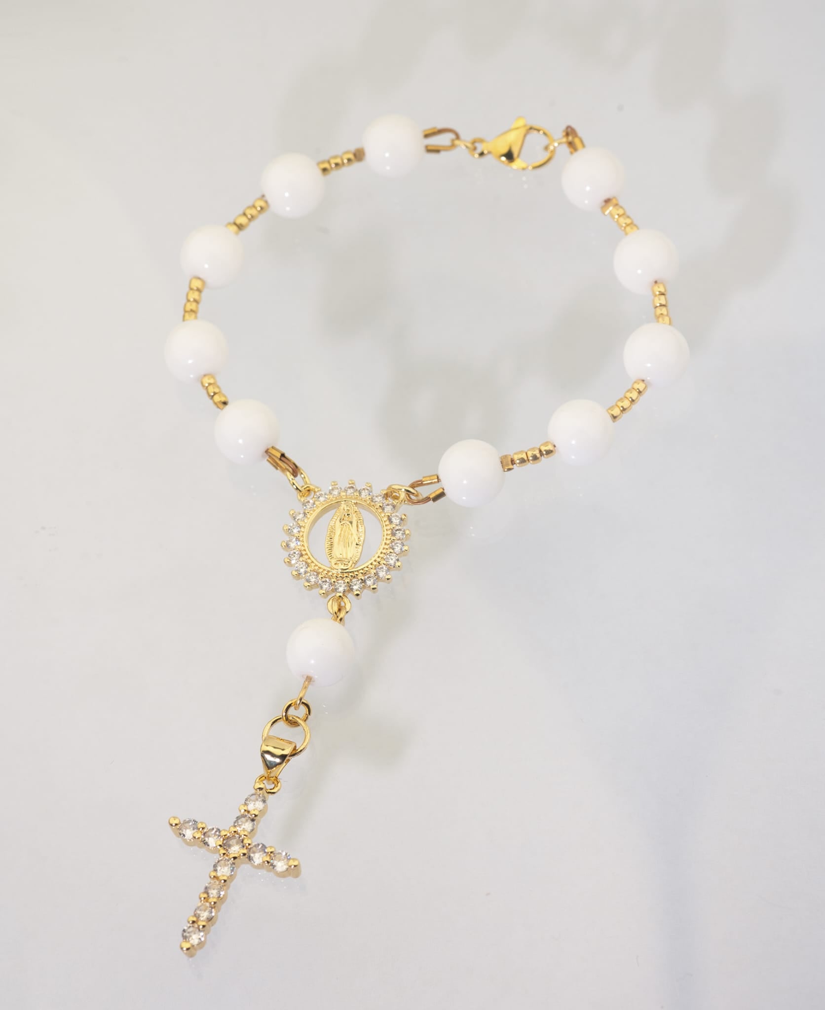 Nerūdijančio plieno kryželis su cirkonio akutėmis suteikia šiam rožančiui švytėjimo ir dvasinio lengvumo.